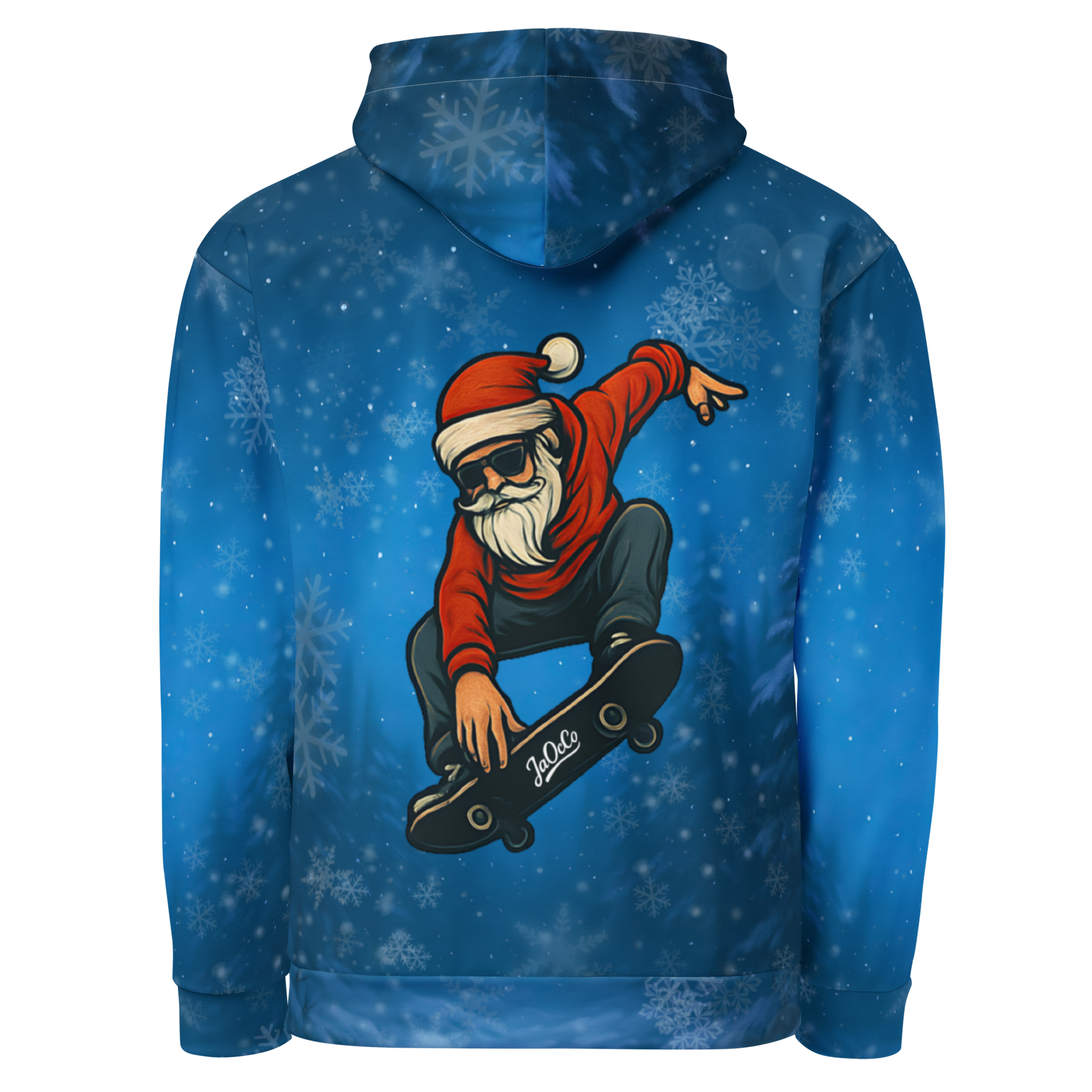 Ein 100 % stylischer Streetwear-Hoodie, um Weihnachten einmal anders zu feiern! Mit seinem eisblauen All-Over-Design und dem Weihnachtsmann auf dem Skateboard verkörpert dieses Modell die Energie und Freiheit des JaOcCo-Geistes. Aus recyceltem Polyester gefertigt, vereint es Komfort, Mut und einen klaren Nachhaltigkeitsansatz.